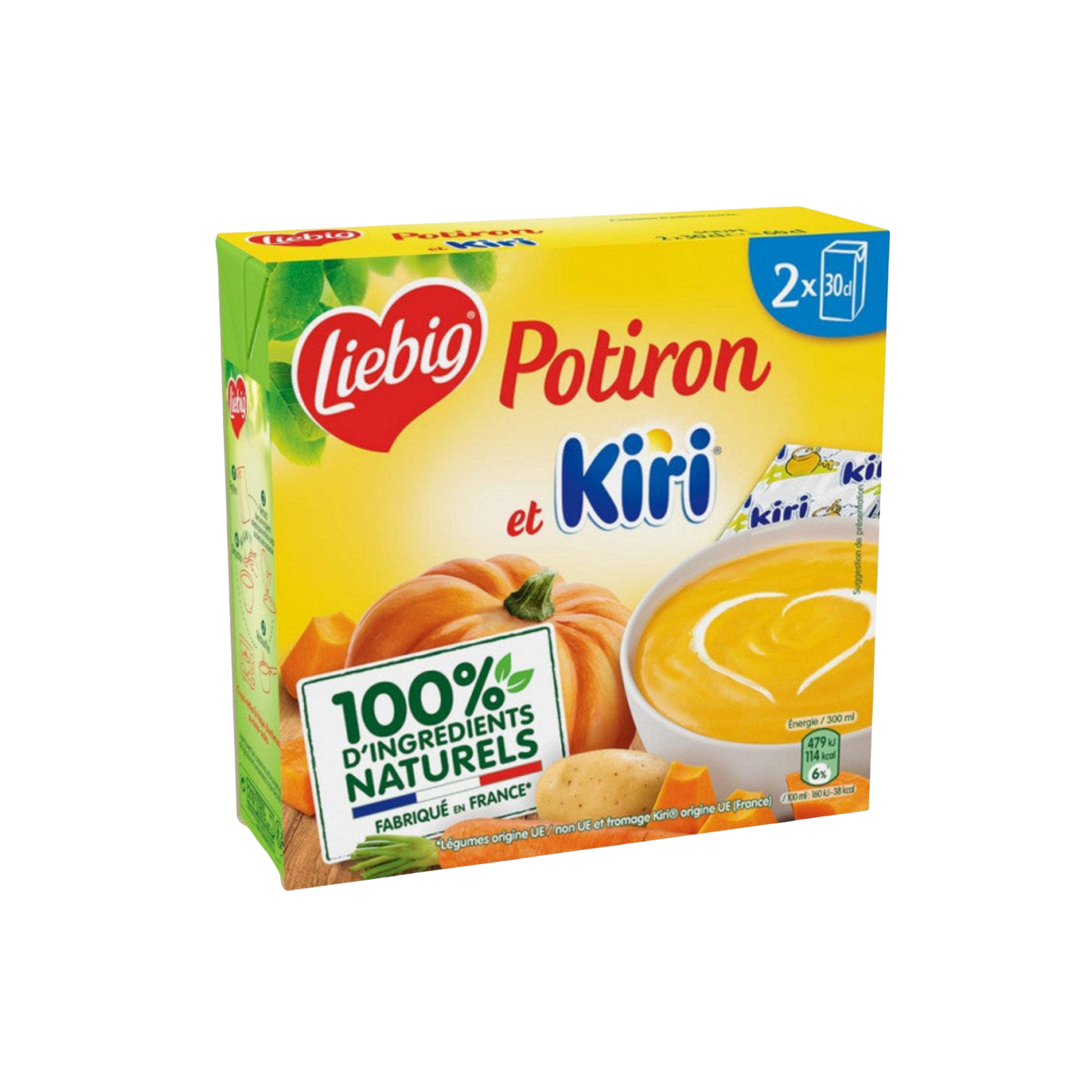 Redécouvrez le goût de soupe velouoté de potiron et kiri. 100% d'ingrédients d'origine naturelle cette recette est cuisinée à base d'ingrédients 100% naturels. elle est sans conservateur, sans exhausteur de goût, sans colorant et est fabriquée dans notre usine près d'avignon en provence. liebig est l'inventeur de la soupe en brique qui préserve la qualité des légumes. cette recette liebig est fabriquée dans notre usine près d'avignon en provence. nos.